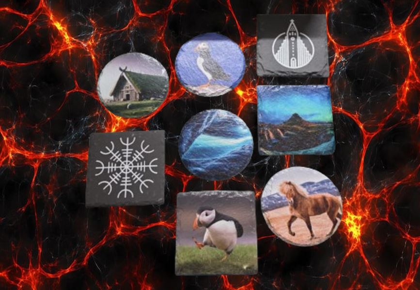 Lava stone coasters with a variety of designs inspired by Iceland, featuring elements related to its nature, culture, and landscapes. Functional and decorative, they protect surfaces while adding a unique Icelandic touch to any space.