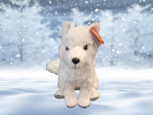 A soft and charming snow fox plush, featuring fluffy white fur that invites warm hugs. Its bright eyes and pointed ears give it a sweet expression, while its bushy tail adds a touch of realism and coziness. Perfect for accompanying children and animal lovers during moments of comfort and relaxation.